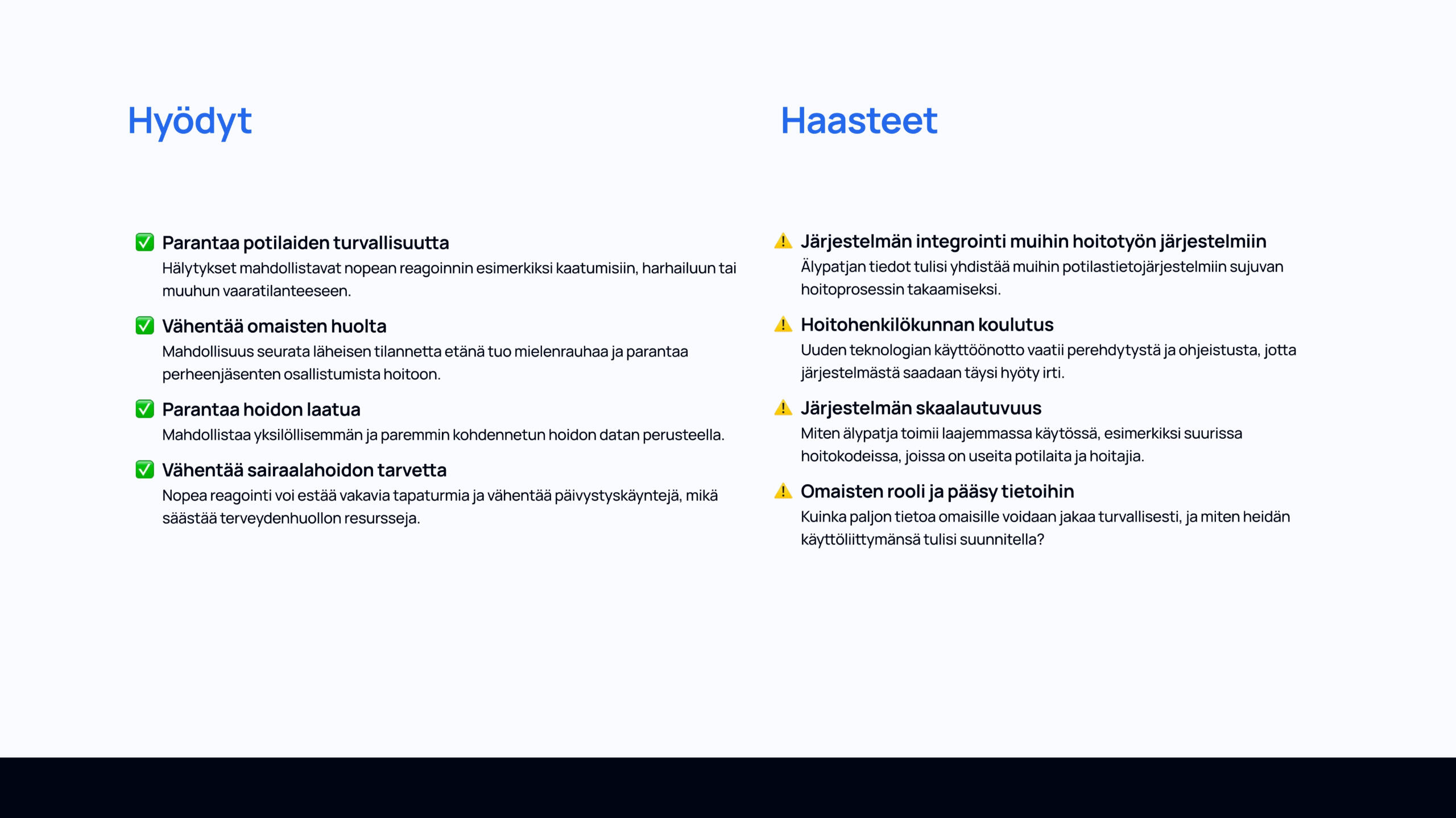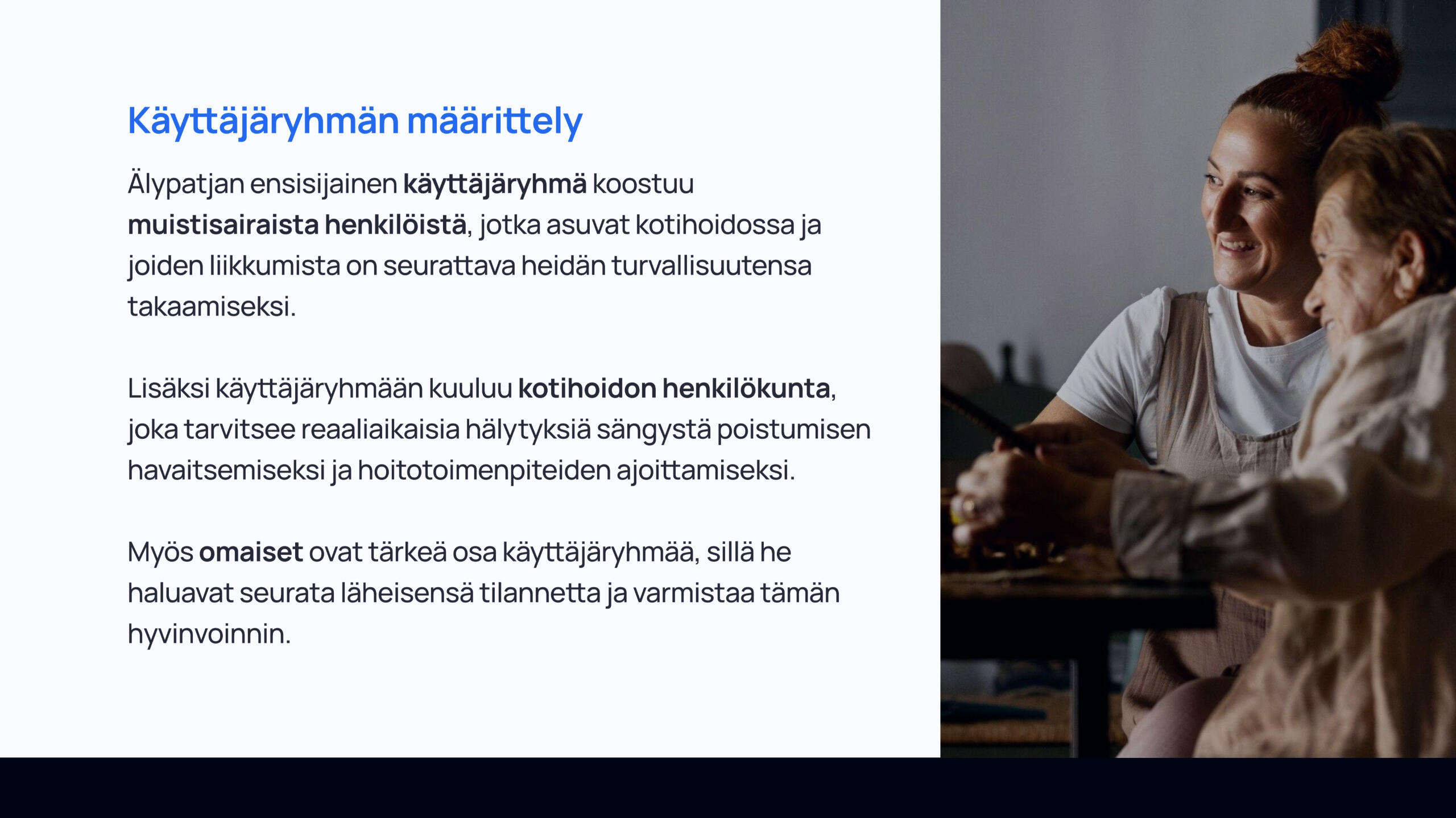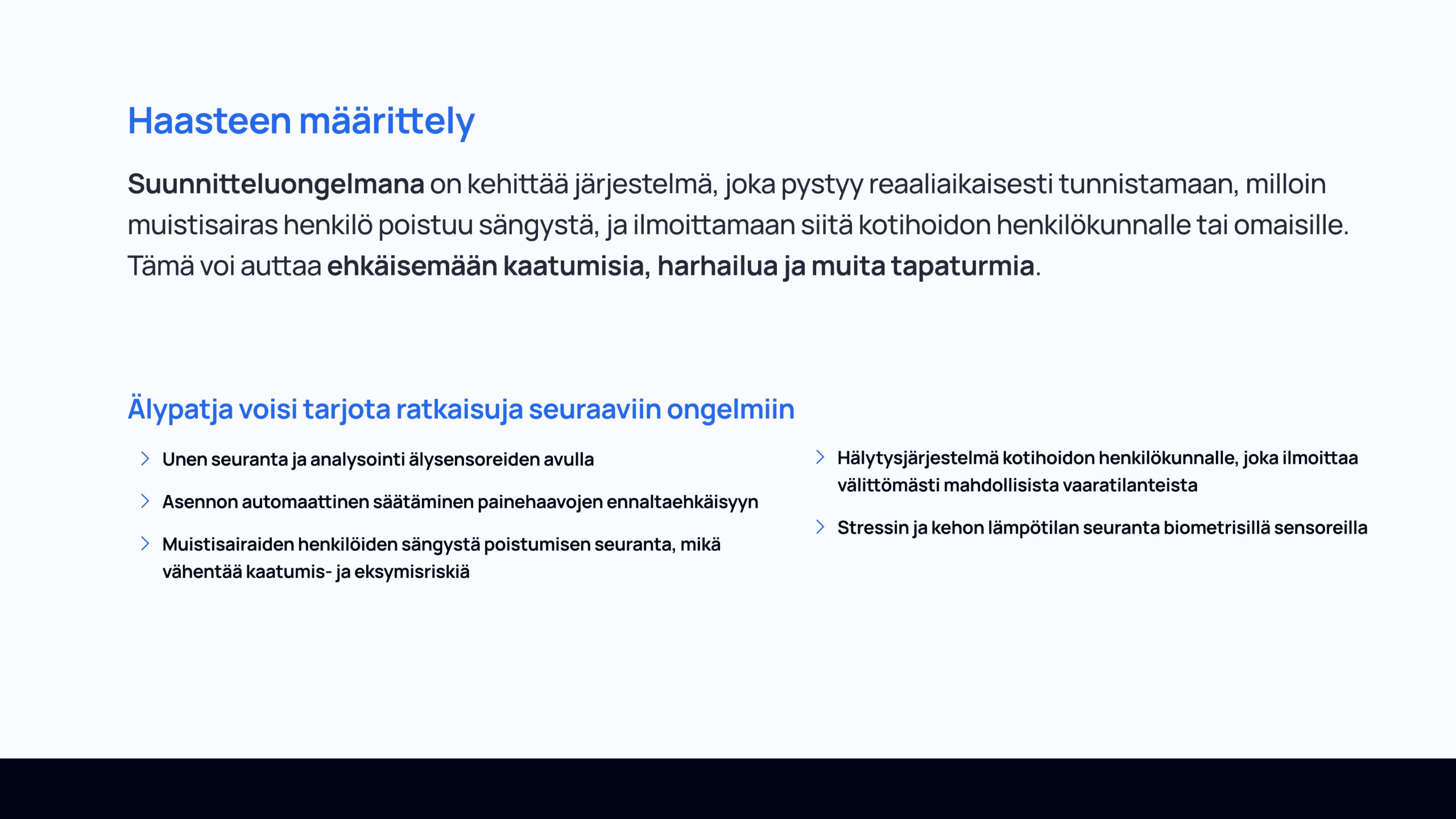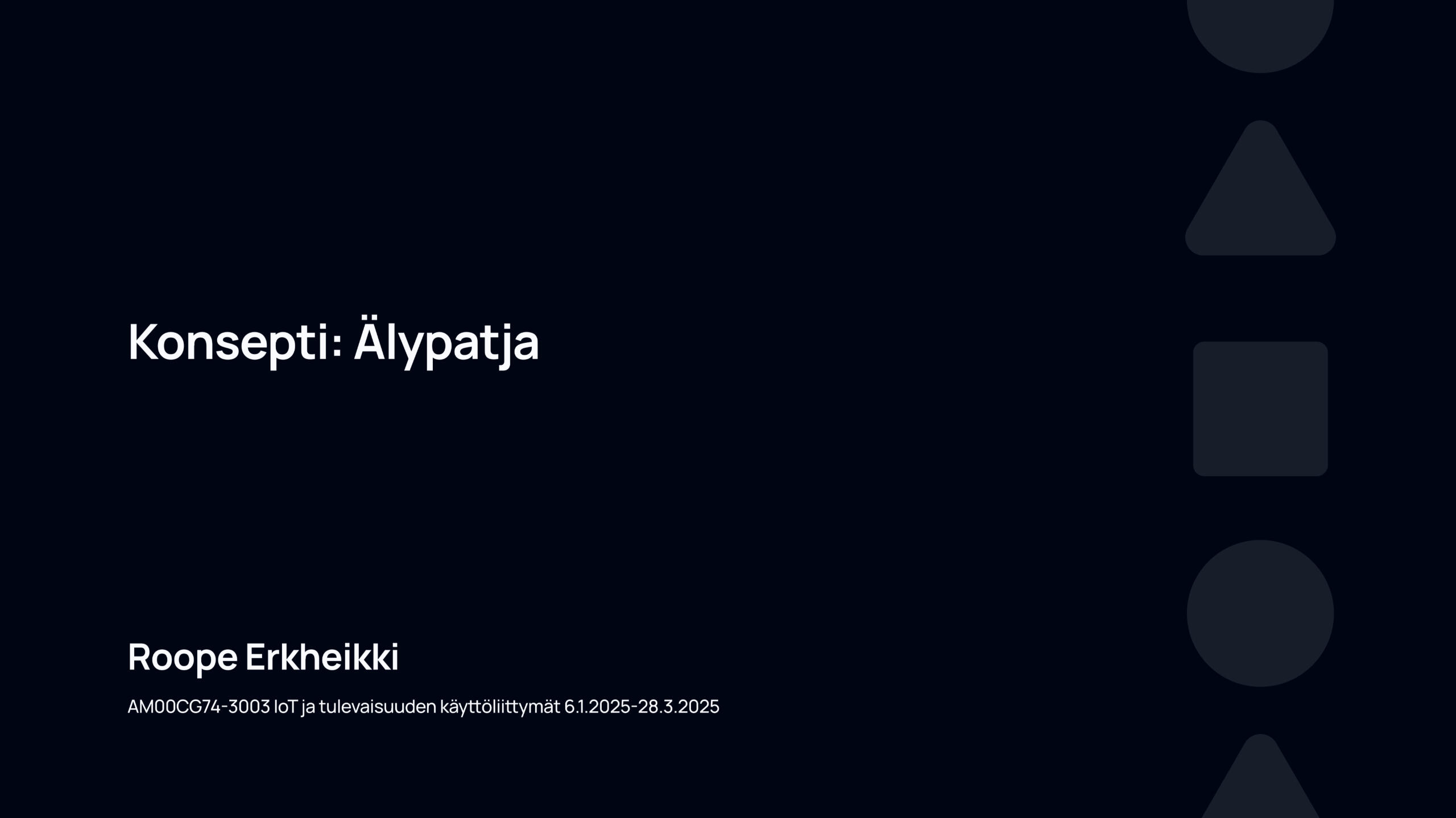Kurssilla IoT ja tulevaisuuden käyttöliittymät (6.1.2025–28.3.2025) toteutin lopputyöni nimeltä Älypatja. Projektin tavoitteena oli suunnitella IoT-teknologiaa hyödyntävä ratkaisu, joka parantaa kotihoidossa asuvien muistisairaiden turvallisuutta ja hyvinvointia. Älypatja seuraa käyttäjän liikkeitä, unenlaatua ja elintoimintoja sensoreiden avulla sekä lähettää automaattisia hälytyksiä hoitohenkilökunnalle vaaratilanteissa. Suunnittelin käyttöliittymän hoitajille ja omaisille, joiden tarpeet erosivat toisistaan, mutta yhdistyivät reaaliaikaisen tiedon ympärille.