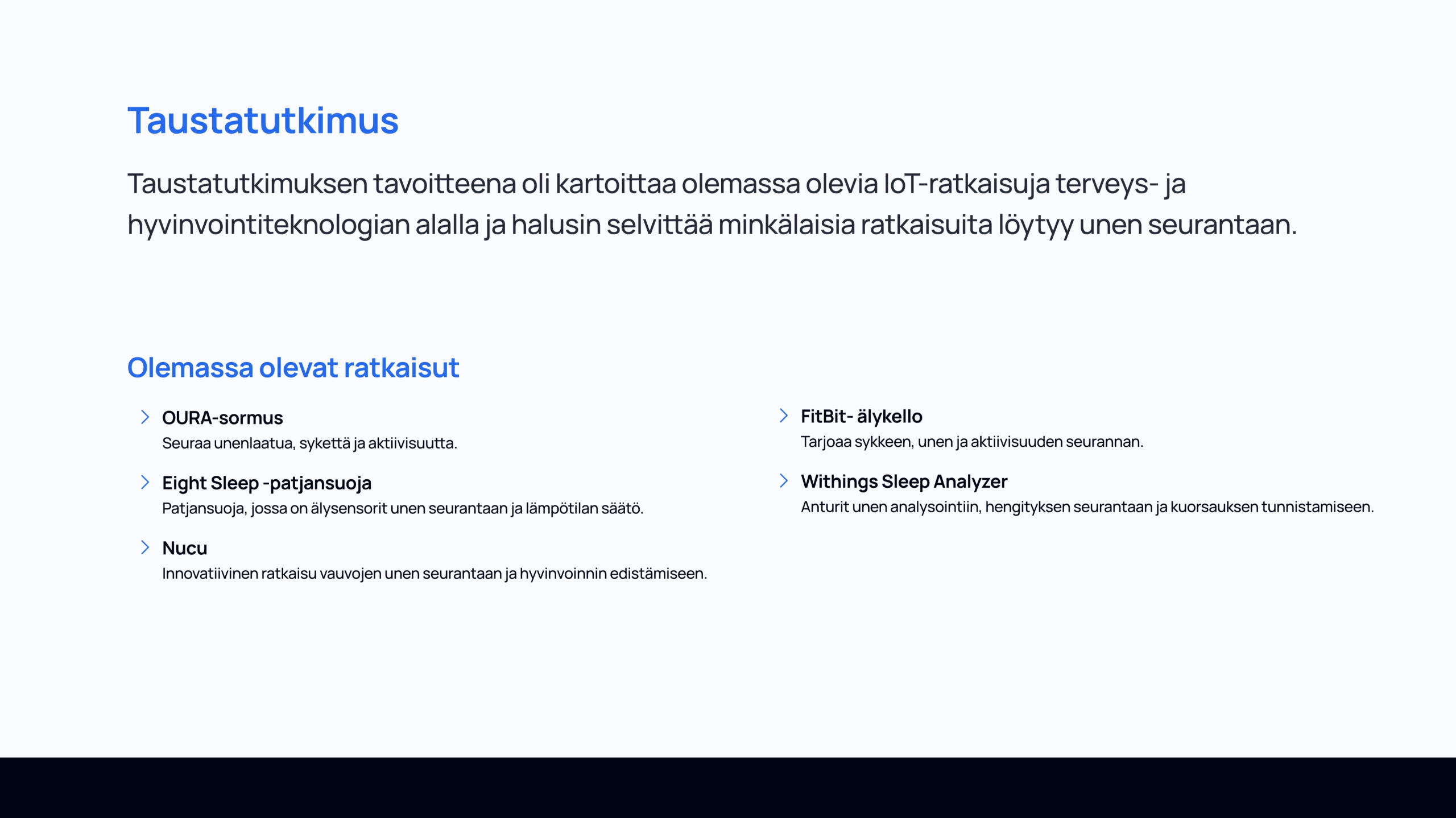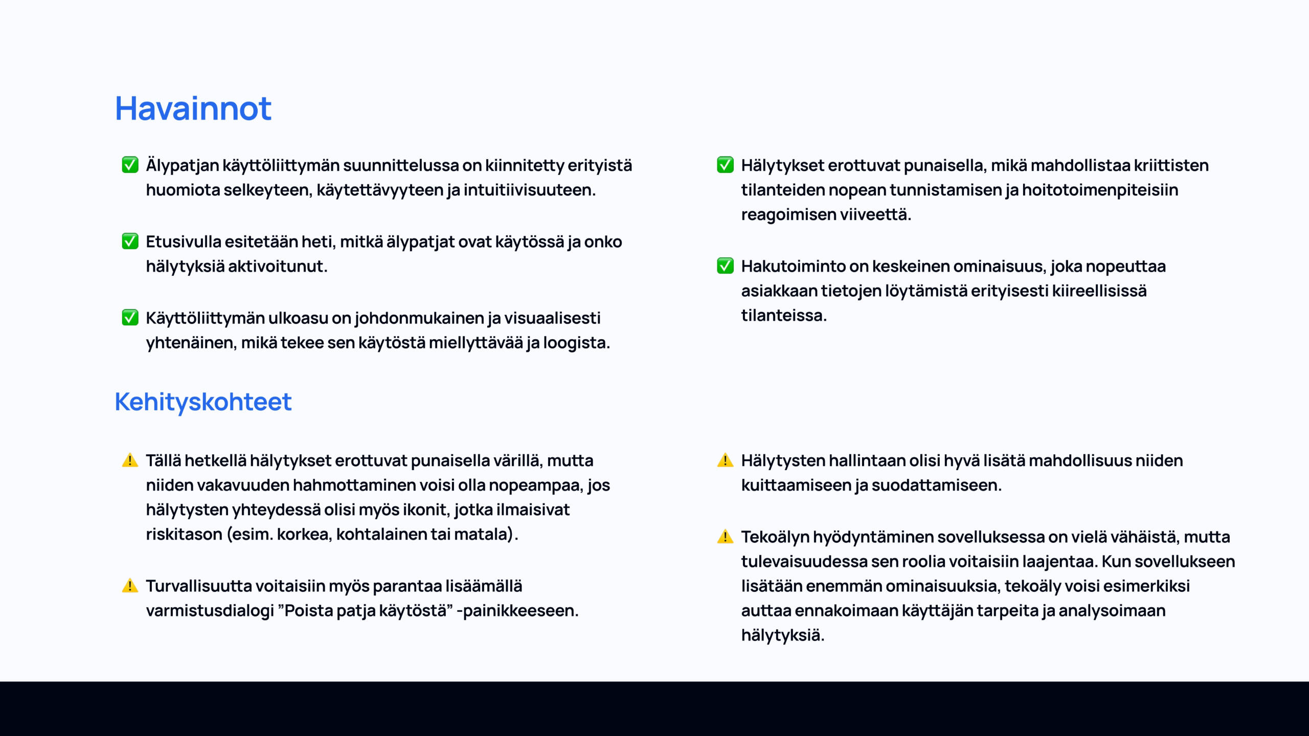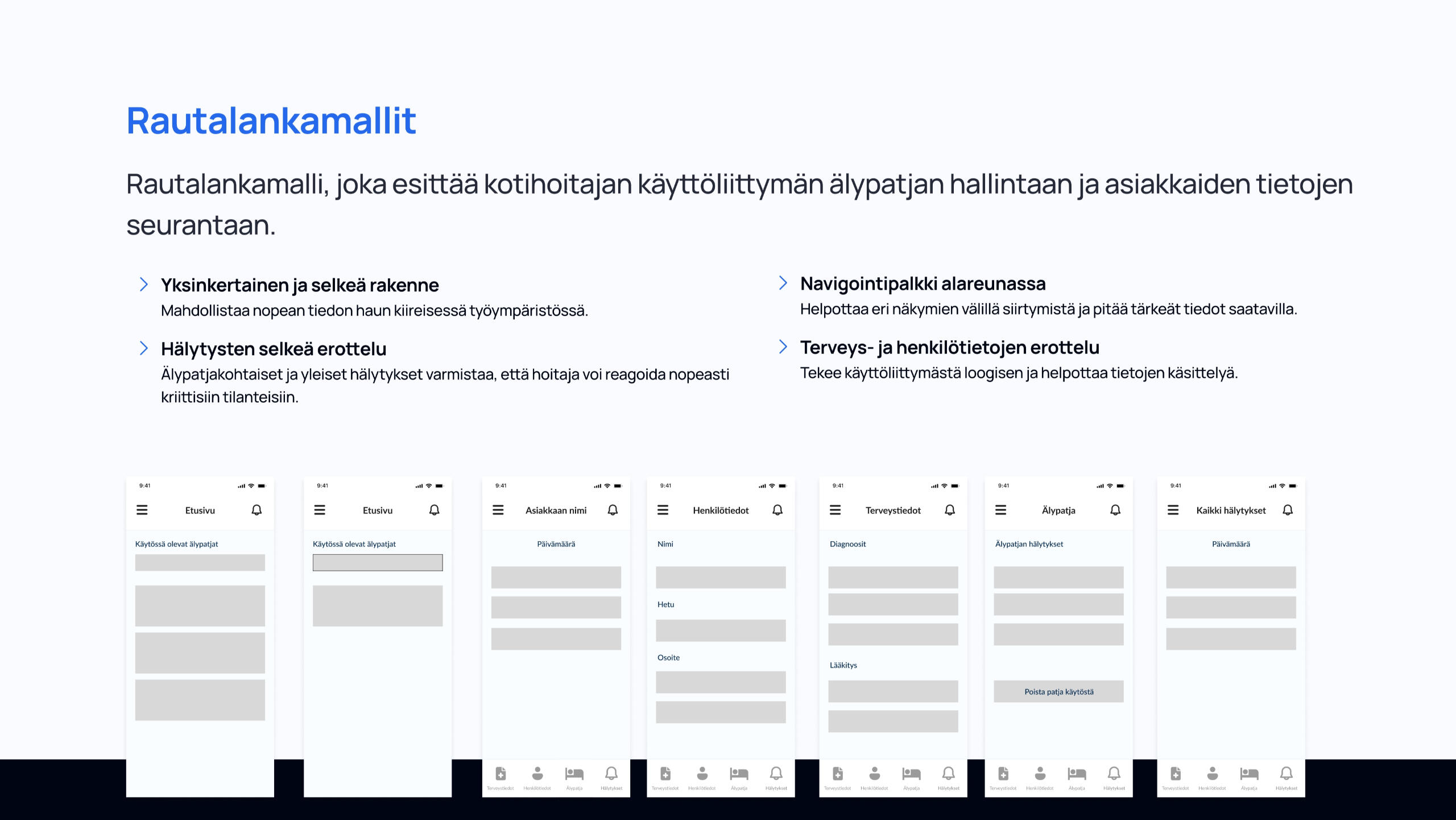 Kurssin lopputyönä tuli suunnitella IoT-konsepti, laatia siitä rautalankamallit ja viimeistelty prototyyppi Figmalla. Työssäni vastasin koko suunnitteluprosessista: taustatutkimuksesta ja ongelman määrittelystä aina käyttöliittymän rakenteen, visuaalisen ilmeen ja käytettävyyden suunnitteluun. Lopputuloksena syntyi toimiva ja saavutettava käyttöliittymäkonsepti, joka tukee älypatjan datan hyödyntämistä hoitotyössä.