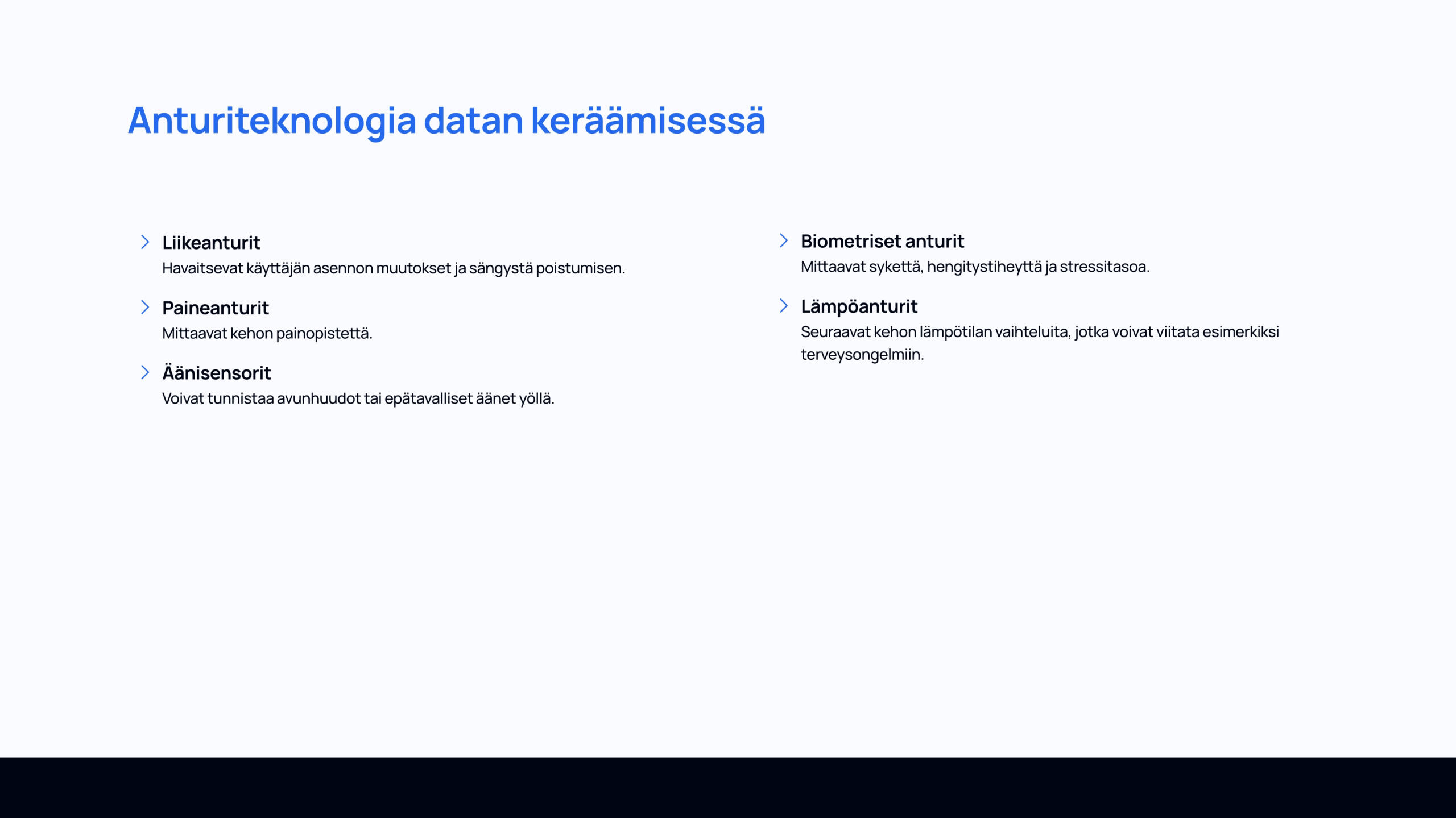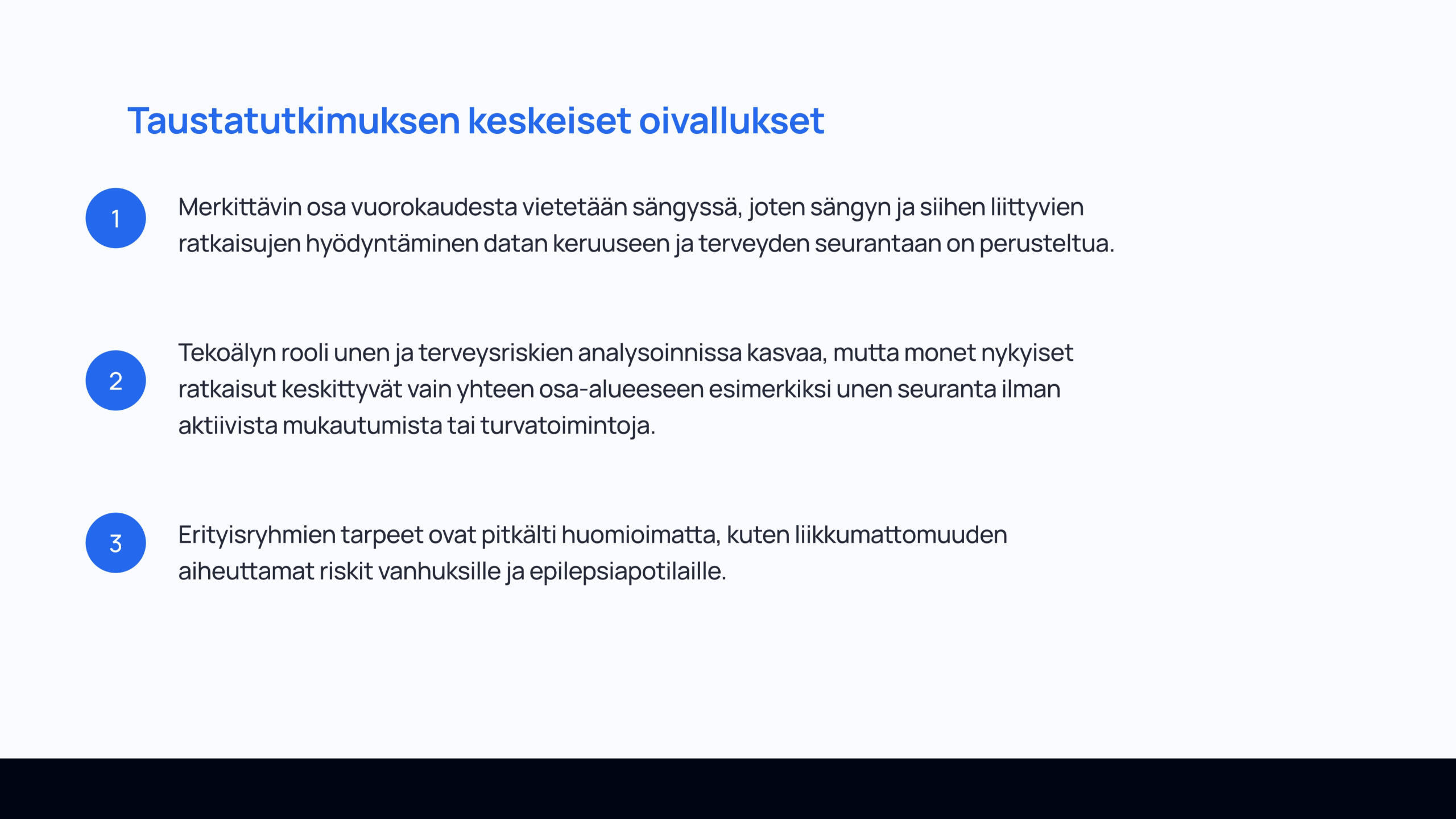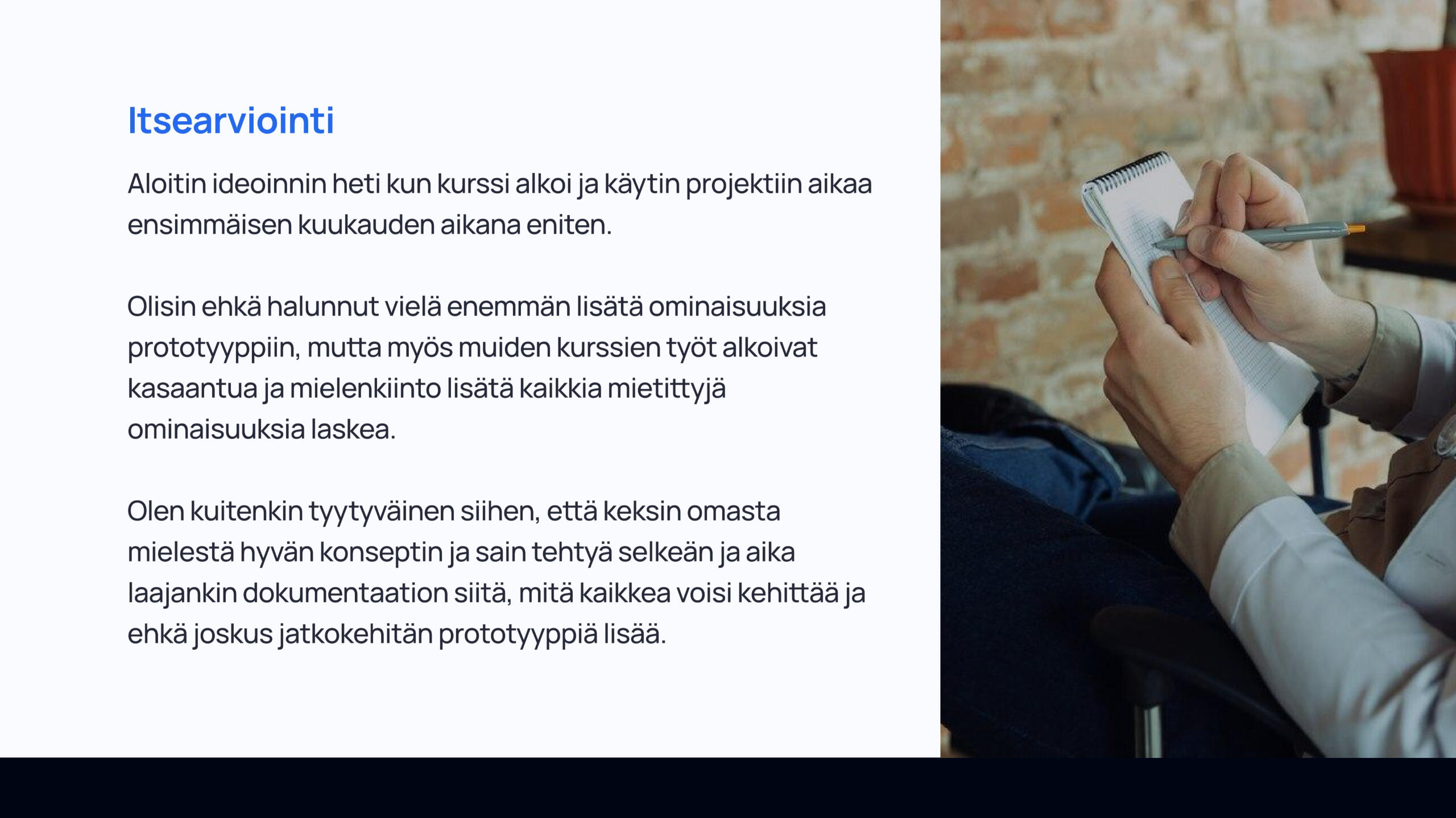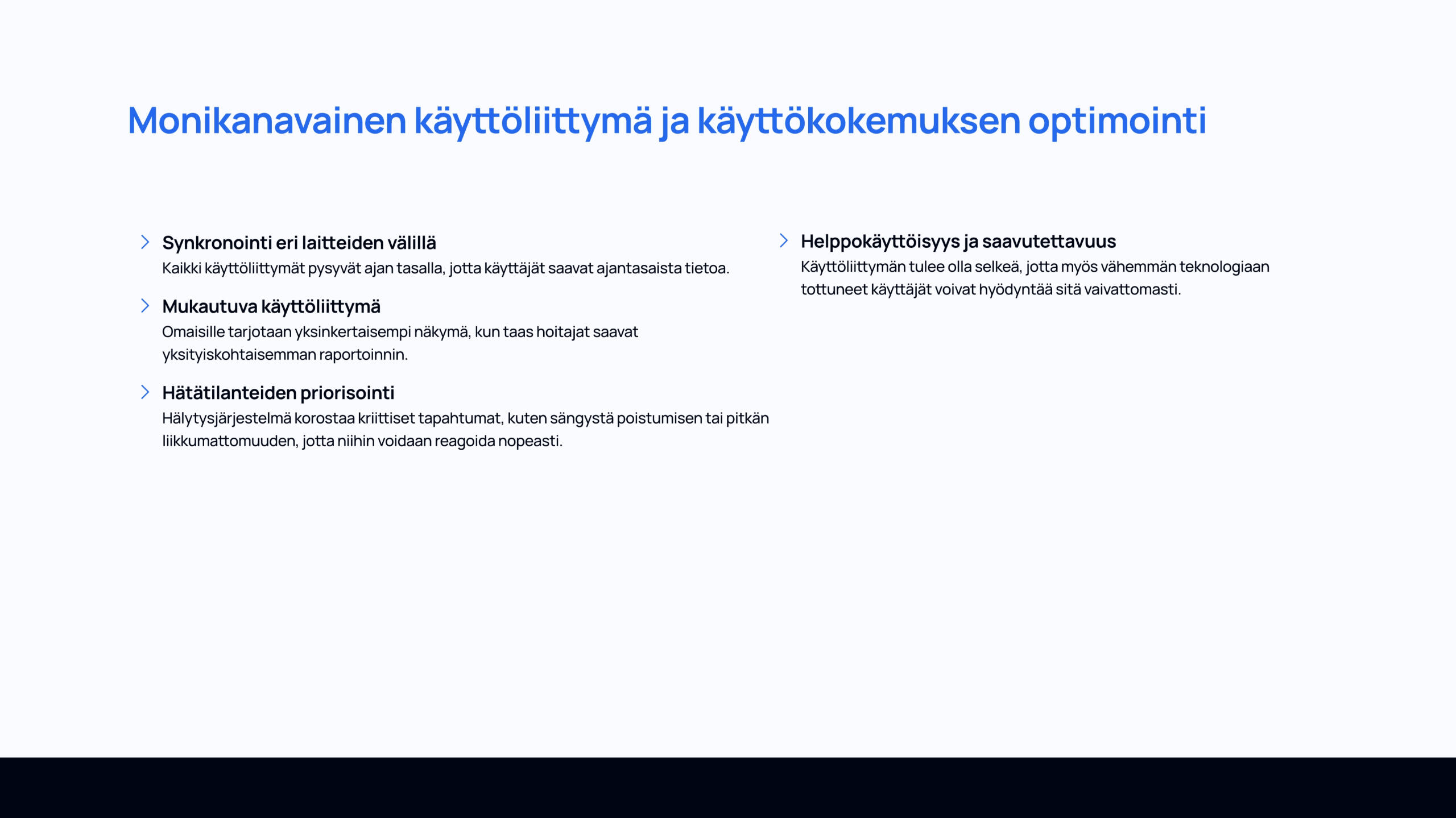Kurssin lopputyönä tuli suunnitella IoT-konsepti, laatia siitä rautalankamallit ja viimeistelty prototyyppi Figmalla. Työssäni vastasin koko suunnitteluprosessista: taustatutkimuksesta ja ongelman määrittelystä aina käyttöliittymän rakenteen, visuaalisen ilmeen ja käytettävyyden suunnitteluun. Lopputuloksena syntyi toimiva ja saavutettava käyttöliittymäkonsepti, joka tukee älypatjan datan hyödyntämistä hoitotyössä.